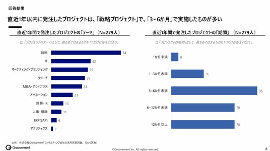 直近1年以内に発注したプロジェクトのテーマでは、「戦略」(74件)が最も多く、次いで「IT」(42件)、「マーケティング・ブランディング」(39件)となりました。