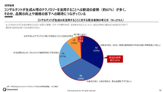 - コンサルタントが生成AI等のテクノロジーを活用することに対しては、総じて歓迎の姿勢が強い(67%)。