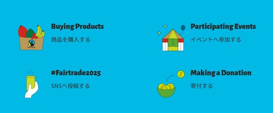 ◆参加方法:フェアトレード商品の購入、#Fairtrade2025のSNS投稿、全国のフェアトレード関連イベントへの参加、フェアトレード・ラベル・ジャパンへの寄付、登録レストランでのフェアトレードドリンク・フード購入など、フェアトレードに関するアクションを行う