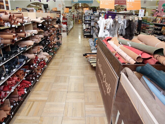 レザー売場では約2,000種類の商品を品揃えします。レザーヌメ革、ボリュームたっぷりの端革パック、小物作りにおすすめのカット革から大判吊るし革まで取り揃え、工具、金具も豊富にあるので、初心者でも気軽に挑戦できます。