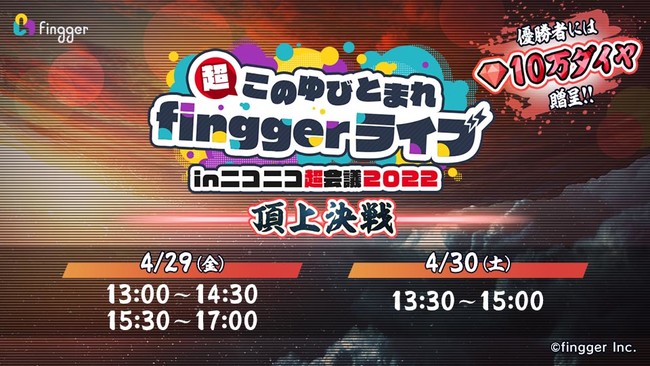 まずは2022年4月17日(日)まで開催中のイベント「fingger ニコニコ超会議2022 配信出演権争奪戦」にて決まる、出場権をかけた白熱した戦いに、ぜひご注目ください。