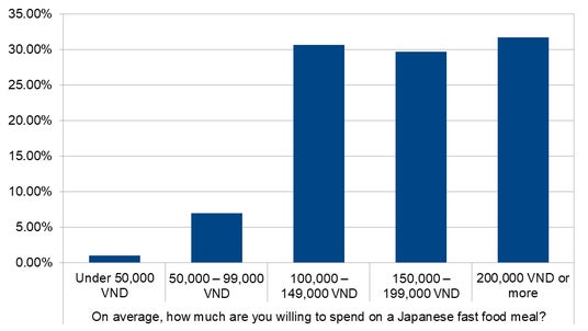 1食あたりの支出額は100,000~149,000VND(約650~970円)が30.7%、200,000VND以上(約1,300円以上)が31.7%と、比較的高価格帯でも受け入れられている。