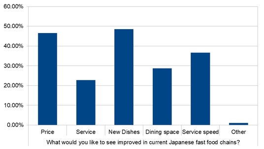 ・ 全体の評価では「とても良い」35.6%、「良い」61.4%と満足度は高いが、改善要望として「新メニューの追加」(48.5%)、「価格の見直し」(46.5%)、「提供スピードの向上」(36.6%)が挙げられた。