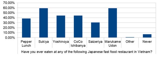 ・ 1食あたりの支出額は100,000~149,000VND(約650~970円)が30.7%、200,000VND以上(約1,300円以上)も31.7%と、高価格帯の利用者が多い。選ばれる理由は「おいしさ」(68.3%)、「清潔さ」(65.4%)、「日本食が好き」(64.4%)が上位で、価格やサービスよりも品質志向が強いことがうかがえる。