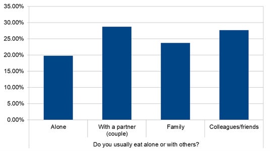食事の同行者は「パートナーと」(28.7%)、「友人・同僚と」(27.7%)、「家族と」(23.8%)が多く、1人利用(19.8%)も少なくない。