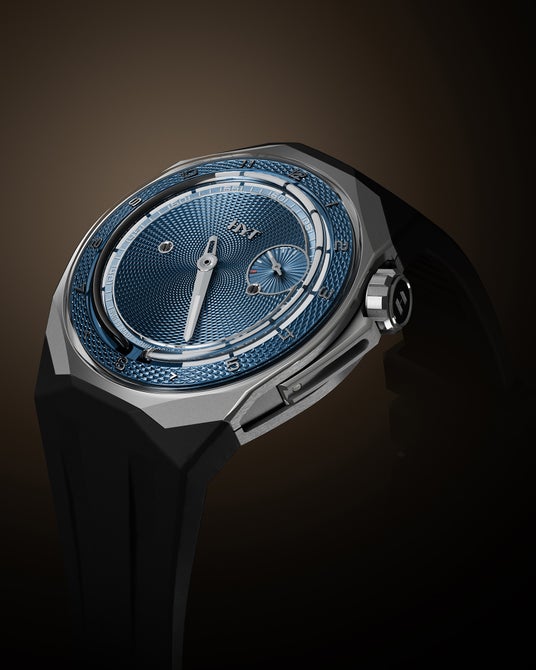 8本限定の T1 チタン ギョーシェには、2本のストラップが付属します。ラグジュアリーなブルーのアリゲーターレザーストラップと、スポーティなピュアブラックのラバーストラップです。どちらのストラップも、サテン仕上げとサンドブラスト仕上げを施したチタン製ピンバックルを採用しています。丈夫で扱いやすいクイックチェンジシステムにより、簡単にストラップを交換し、ドレッシーな装いとカジュアルな装いを切り替えることができます。