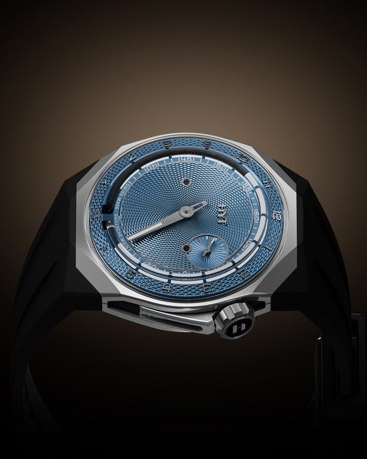 時刻は、レトログラード式流体による時間表示と、大ぶりの鮮やかなブルーの文字盤の中央にある大きな分針によって表示されます。ハイテクのホウケイ酸ガラス製キャピラリーチューブは、6時位置でから伸びています。チューブの内部では、ブラックの流体がフランジ上の時を示す目盛を通過しながら移動します。