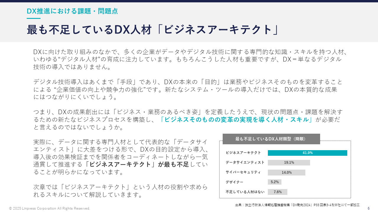 実際に、データに関する専門人材として代表的な「データサイ エンティスト」に大差をつける形で、DXの目的設定から導入、 導入後の効果検証までを関係者をコーディネートしながら一気通貫して推進する「ビジネスアーキテクト」が最も不足してい ることが明らかになっています。