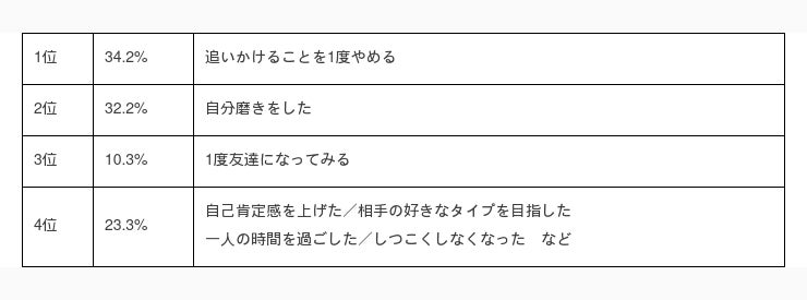 アンケートの結果、元彼と復縁できた時の努力・方法として『追いかけることを1度やめる』ということを選択する女性が多い傾向でした。