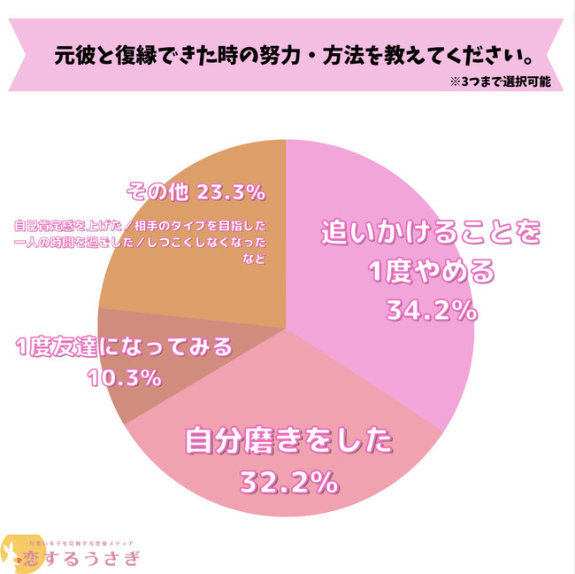 恋するうさぎ編集部が行った「元彼と復縁できた時の努力・方法」のアンケートによると1位は追いかけることを1度やめるが34.2%でした。