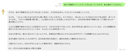 「じーざすAI」の開発は、地方での様々な事業のハードルや困難に直面する地域のプレイヤーが疲弊する姿を目の当たりにし、地域のプレイヤーのメンタルヘルスに与える問題についてなんとかできないかと考えたことが発端です。