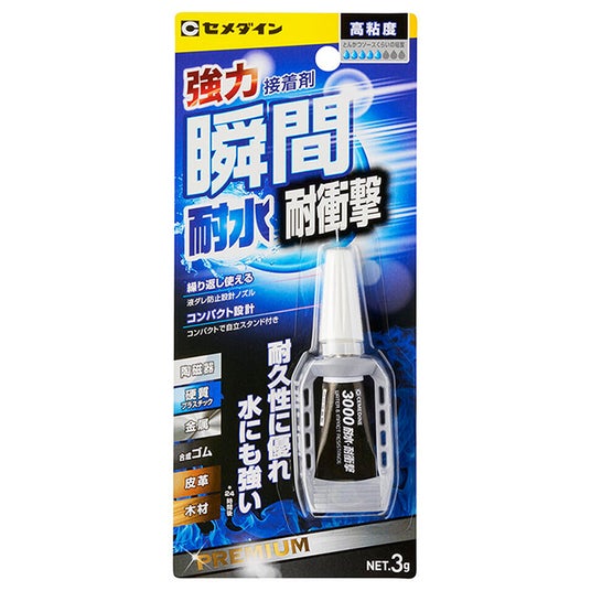●瞬間接着剤「3000耐水・耐衝撃」瞬間接着剤が苦手とする水・衝撃・剥離の力がかかっても剥がれにくい、耐水・耐衝撃性能に優れたハイエンドモデルの瞬間接着剤です。高粘度(とんかつソース程度)で垂れにくく、液だれ防止ノズルで作業性に優れます。