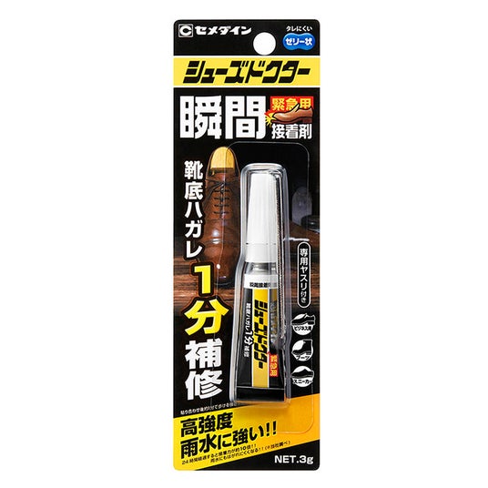・シューズドクター瞬間接着剤緊急時、靴底剥がれを貼り合わせ1分で応急補修できます。貼り合わせから24時間後には接着強度が約10倍に達し、高強度で雨水にもはがれにくくなります。外出中、靴のつま先や靴底が剥がれた等の突然のトラブルに活躍します。