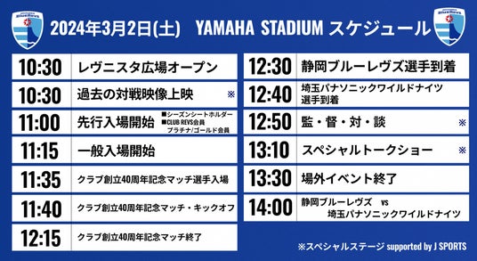 2024 年 3 月 2 日(土)に開催される、NTT ジャパンラグビー リーグワン 2023-24 DIVISION 1 第 8 節(医)R&O presents ベルテックス静岡マッチデー 埼玉パナソニックワイルドナイツ戦(14:00 キックオフ/ヤマハスタジアム) にて、リーグワン全試合を放送いただいている J SPORTS 様のご協力のもと、場外レヴ二スタ広場にて「スペシャルステージ supported by J SPORTS」を行うことが決定いたしましたので、お知らせいたします。