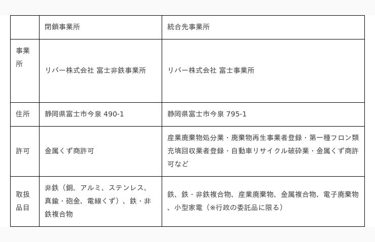 当事業所は、非鉄金属専門の事業所として静岡県富士エリアの非鉄金属を中心に選別、加工を行うことでリサイクルに貢献してきました。しかし、リバーの競争力強化に向けた経営資源の最適化を検討するなかで、業務の効率化を図るため、富士事業所に事業所機能を統合することが望ましいとの判断に至り、2024 年4月 30 日をもって当事業所の営業を終了することといたしました。