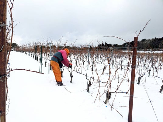 冬 剪定時期や天候など1月中旬から積雪が増え腰の高さほどの積雪となりました。仮剪定作業の進捗状況が不安でしたが、2月上旬までに仮剪定作業を完了することができました。