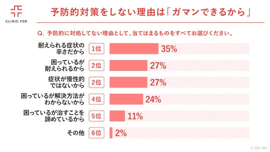 と、不調をガマンしている傾向にあることがわかりました。一方で、「困っているが解決方法がわからないから」も4人に1人(24%)存在し、適切な対処方法が浸透していない現状が示唆されます。