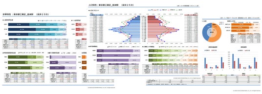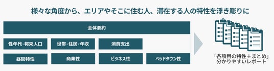各レポートはA4サイズ1枚分程度に要約し、各項目毎に解釈しやすい「まとめ」を付与することで、分析に不慣れな方や分析担当者以外でも、エリアやそこに住む(いる)人々の特性を具体的に理解できるよう支援します。