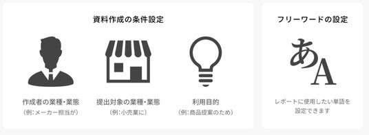商圏レポートを出力する前に、資料作成の前提条件(誰が、誰に、どんな目的で使うレポートなのかを設定)やフリーワード(レポートに使用したい単語)の設定等ができ、各種設定に沿ったレポートを自動出力できます。この設定により、汎用的な表現ではなく、自社のビジネスに合った形の理解しやすいレポート表現に調整できます。