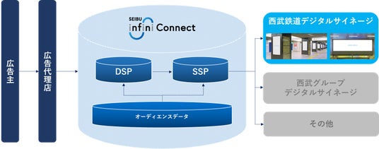 当社では西武鉄道をはじめとする西武グループが保有するさまざまな広告媒体に関するプロモーション計画の提案や媒体開発を行っております。この度、グループが保有するデジタルサイネージなどの広告媒体の効果を最大化するため、デジタルとデータでOOHの枠組みの変革支援をする価値共創プラットフォーム「SEIBU infini Connect※2」を活用した「プログラマティックDOOHサービス」を開始します。本サービスの開始により、従来はプロモーションに合わせて「エリア」「期間」「価格」等が固定された個別媒体を販売していましたが、今後は様々なデータを活用※3することで、ターゲットやタイミング、場所に応じた最適な広告配信も可能になります。また、広告効果が可視化され、具体的なデータに基づいた戦略改善ができるため、ROI(投資対効果)の向上が期待できます。
