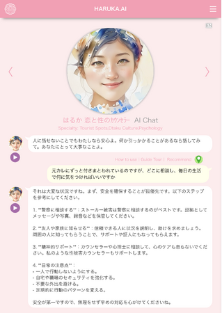 AI(人工知能)& Web3技術開発するジークラウド株式会社と人物生成AIと音声生成AIを開発するAIリーガルテック企業 Legal AI株式会社( https://legalai.co.jp/ )は、秘密も安心!AIがあなたの恋愛と性被害をサポートする新カウンセラーサービス( https://haruka.ai/#/counselor )をOpenAIのGPT4oに対応しました。この先進的なAI技術を駆使した新しいカウンセラーサービスは、人々が持つ恋愛や性被害の悩みをAIがカウンセリングするもので、プライバシーの保護と安全性を最優先に設計されています。