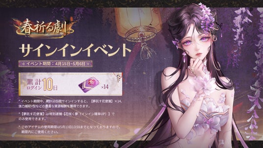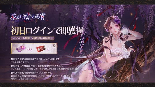 ■ イベント説明:イベント期間中、ゲームにログインするとイベント画面で限定ログイン報酬「夢託す花便箋×10」「衣装お楽しみ券×1」を獲得できます。