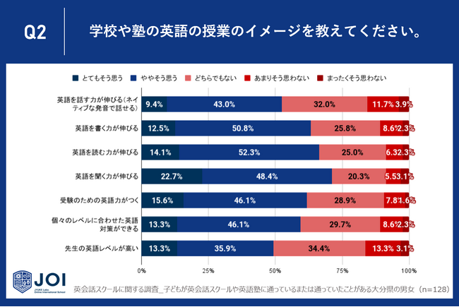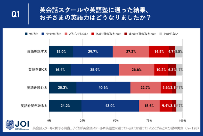 じゅけラボOnlineインターナショナルスクールJOIは、子どもが英会話スクールや英語塾に通っているまたは通っていたことがある大分県の男女128人に、英会話スクールや英語塾の効果に関するアンケート調査を実施しました。