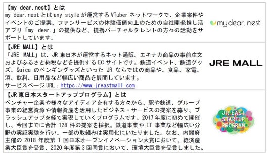 〇東日本旅客鉄道株式会社(代表取締役社長:喜㔟陽一、以下「 JR 東日本」)、株式会社 JR東日本商事(代表取締役社長:井上晋一)、JR東日本スタートアップ株式会社(代表 取締役社長:柴田裕)は、 JR 東日本スタートアッププログラム 2023 秋の採択企業で あり、 VTuber 推し活アプリ「my dear.」 や VTuber ネットワーク 「my dear. nest 」を活用したマーケティング事業の提供を行う、株式会社 any style(代表取締役:萩原 湧人、以下「 any style 」)と連携し、 JRE MALL初となる VTuber による地産品を集 めたライブコマース「JRE MALL × my dear. nest VTuber地域応援プロジェクト」を 実施します。