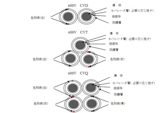 絶縁体が架橋ポリエチレンのビニルシースケーブルで、単心ケーブルを2条より合わせたものをCVDケーブル、3条より合わせたものをCVTケーブル、4条より合わせたものをCVQケーブルとなります。架橋ポリエチレンとは、高分子の分子鎖を立体網目状構造に分子間結合を行わせることで(「架橋」反応と呼ぶ)、耐熱性、耐薬品性を高めています。さらに、数本をより線となっていて介在がないため、以下の特徴があります。