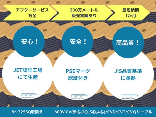 再生可能エネルギー、EV自動車部品、AI及びIoT領域における先進技術を駆使し、グローバルで急速に成長しているGBP株式会社(本社:東京、以下GBP)は、CVD・CVQケーブルの大量受注販売を開始することをお知らせいたします。先日、CVTケーブルの販売開始を公表後、全国からお問い合わせが殺到しました。お客様のご希望にできる限り応えるため、CVD・CVQケーブルの大量受注販売も開始する運びとなりました。一貫して日本メーカーとしての品質保証にこだわり、JISC3605基準品でJET認証工場にて生産し、PSEマーク付きの製品となります。日本メーカーならではの安心・安全・高品質を求めるぜひGBPをご検討ください。