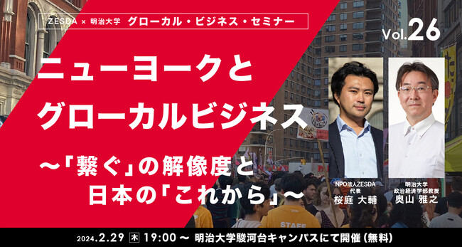 グローカル・ビジネス・セミナーシリーズのVol.26として、「ニューヨークとグローカルビジネス~「繋ぐ」の解像度と日本の「これから」~」を2024年2月29日に開催しました。