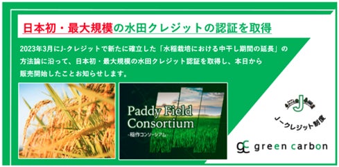 Green Carbon株式会社(代表取締役:大北潤、以下Green Carbon(読み;グリーンカーボン))は、2023年3月にJ-クレジットで新たに確立した「水稲栽培における中干し期間の延長」の方法論に沿った、日本初・最大規模6,220t-CO2※1の水田クレジット認証を取得し、本日より販売を開始したことをお知らせします。