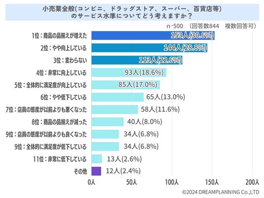小売業全般(コンビニ、ドラッグストア、スーパー、百貨店等)のサービス水準についてどう考えますか?n=500(回答数844 複数回答可)