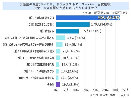 小売店(コンビニ、ドラッグストア、スーパー、百貨店等)でサービスが悪いと感じたらどうする?n=500 (回答数788 複数回答可)
