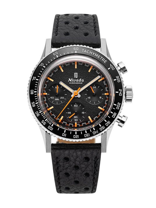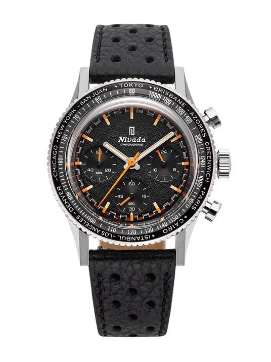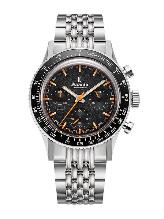 1970年代にインスパイアされたヴィンテージデザインを再現。マットなブラックダイヤルに鮮やかなオレンジのプリントインデックスとエンボス加工されたロゴを備えている。GMTベゼルまたはタキメーターベゼルの選択が可能で、それぞれが時計に異なる個性を与える。このモデルは、実用性とスタイルを兼ね備えたタイムピースとして提供する。