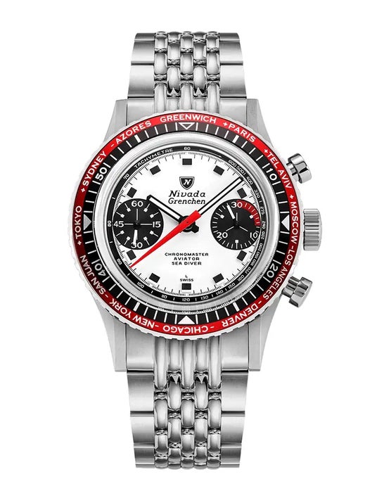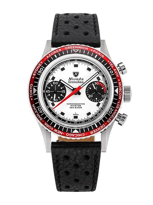 過去にニバダ・グレンヒェンのオンラインのみで販売され即完売し、一躍話題となった「ポールニューマンダイアル」の復刻モデル。ホワイトダイヤルとブラックのサブダイヤルを組み合わせた「パンダ」スタイルは、視認性の高さとスポーティな印象を両立している。赤いクロノグラフ秒針がダイナミックさを加え、タキメータースケールがそのスポーティさを引き立てている。