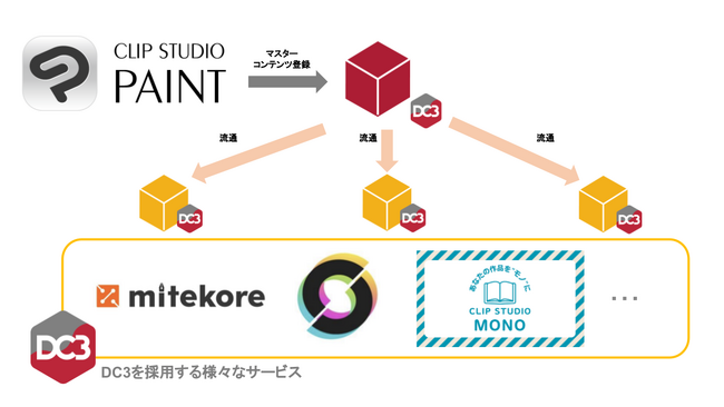 さらに、DC3 の機能であるコンテンツのサービス間移動を利用することで、同社の提供する「CLIP STUDIO MONO」・兼松グランクス様の「mitekore」・とらのあな様の「Creatia」など、DC3を採用した様々なマーケットプレイスで自身の作品を販売することができます。