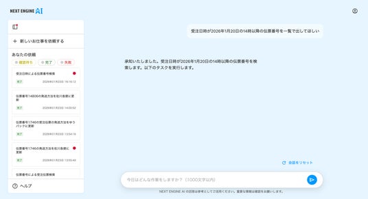 NE(エヌイー)株式会社(本社:神奈川県横浜市、代表取締役社長CEO:比護則良、以下「NE」)は、EC事業者向けに、日常会話で指示するだけで受注処理などの実務をAIが代行する「NEXT ENGINE AI」を正式リリースいたしました。