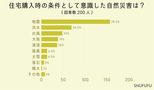 住宅購入時の条件として意識した自然災害を尋ねたところ、1位は地震「(78.5%)」、2位「洪水(34.5%)」でした。ここ十年で大きな地震が数度ありましたし、地震大国の日本では地震を意識せずにはいられないですね。