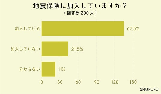 地震保険加入の有無を尋ねたところ、1位は「加入している(67.5%)」、2位「加入していない(21.5%)」となりました。