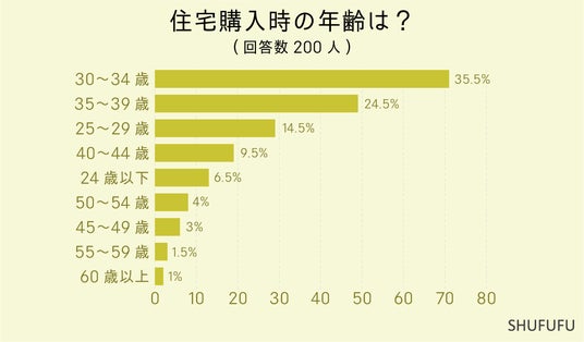 住宅購入時の年齢は?の問いに対して最も多かったのが「30~34歳(35.5%)」でした。 次いで「35~39歳(24.5%)」「25~29歳(14.5%)」という結果でした。 近年の婚姻年齢の平均が30歳前後と言われているので、結婚時や結婚して数年経った時を契機に購入している方が多そうですね。