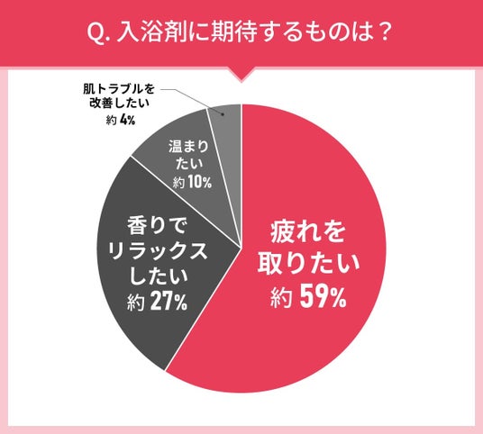 「疲れを取りたい」が約59%と最も多い結果となりました。次いで「香りでリラックスしたい」が約27%、「温まりたい」が約10%、「肌トラブルを改善したい」が約4%と、回答者は入浴剤にさまざまな作用を期待していることがわかります。