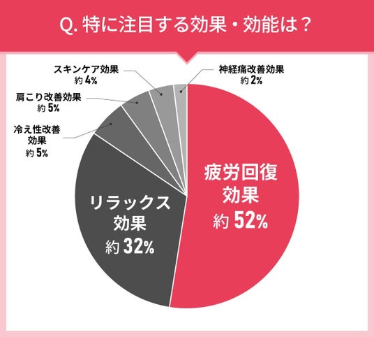 「疲労回復効果」が約52%と、過半数を占めました。次いで「リラックス効果」が約32%、「冷え性改善効果」が約5%、「肩こり改善効果」が約5%、「スキンケア効果」が約4%、「神経痛改善効果」が約2%と、おおよそ入浴剤に期待するものに準じた結果となりました。