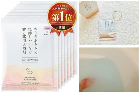 - 医薬部外品の入浴剤のため体の芯から温めてくれ疲れが取れそう。乳白色でとろみのあるお湯が温泉のようでリラックスできる(50代 女性)