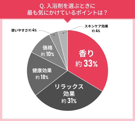 最も多かった回答は、「香り」の約33%でした。入浴剤に期待しているものとして「香り」は2位でしたので少し意外な結果でしたが、気にかけているポイント2位の「リラックス効果」約31%や3位の「健康効果」約18%とあわせて、香りと疲労回復効果のつながりを感じている人が多いのではないでしょうか。また、毎日使うものとして、「価格」や「使いやすさ」を気にかけている人も一定数いました。