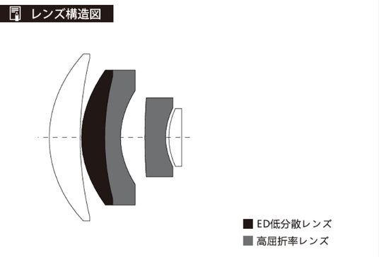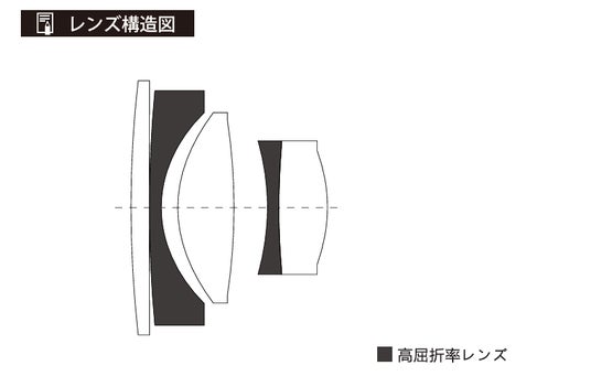 ・倍率:約0.8倍 ・レンズ構成:4群5枚 (高屈折率レンズ2枚) ・画角:約75°