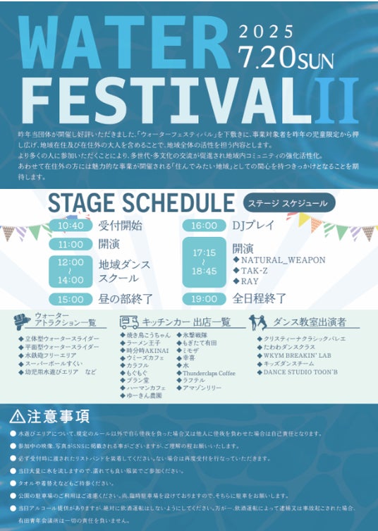 今年のテーマは「多世代・多文化交流」。ウォーターアトラクションやステージパフォーマンスはもちろん、地域グルメやキッチンカーも集結し、子どもから大人まで一日中楽しめる内容となっています。午後の部には豪華アーティストによるライブも開催予定!