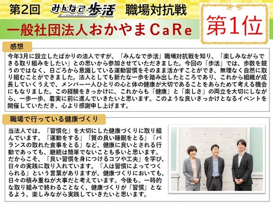 第一位 一般社団法人おかやまCaRe 平均歩数 13,381歩