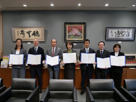 豊島区は、本日4月27日(月)に区役所本庁舎にて、株式会社アニメイト、株式会社サンシャインシティ、株式会社タイトー、東京建物株式会社、株式会社パルコ、株式会社ビックカメラと「災害発生時における情報発信の協力に関する協定」の締結式を開催しました。