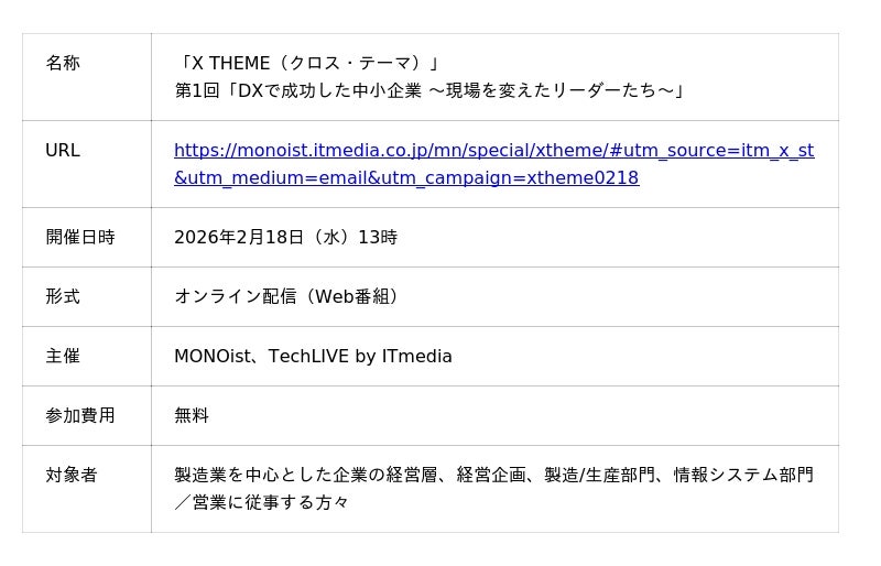 アイティメディア株式会社(本社:東京都千代田区、代表取締役社長 兼 CEO:小林教至、以下、アイティメディア)は、業界で注目を集めるキーパーソン同士が、「いま知りたいテーマ」について本音で語り合うクロストークWeb番組「X THEME(クロス・テーマ)」の放送を開始します。第1回「DXで成功した中小企業 ~現場を変えたリーダーたち~」は、DX推進で成功した中小企業の経営者3名が、現場の課題解決から始まった「地に足のついたDX」の秘訣を語る番組です。番組は2026年2月18日(水)13時から配信予定です(視聴無料)。